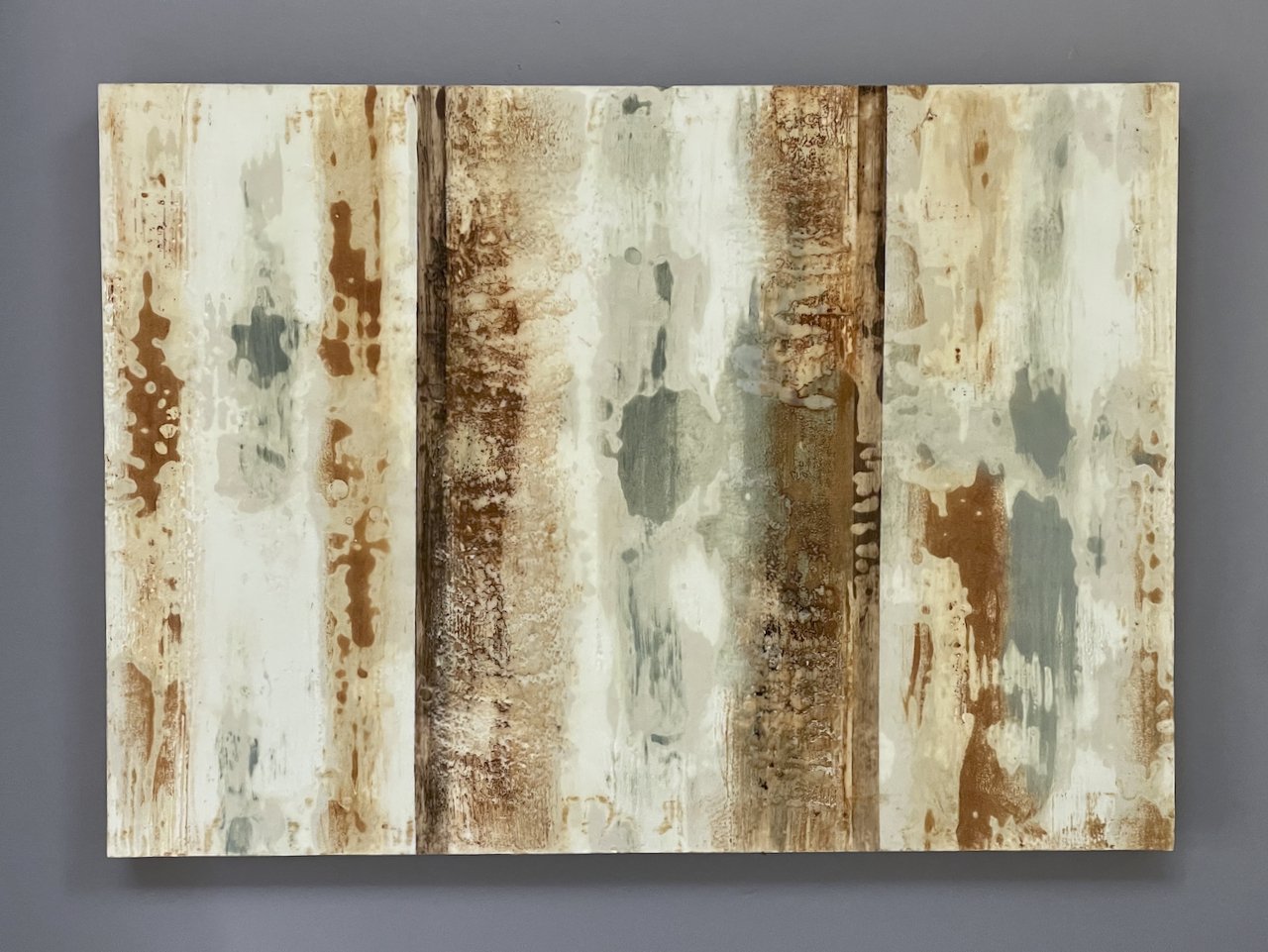 My paintings employ a palette of natural mineral pigments, inks, and graphite, with encaustic, cold wax medium, linseed oil, or nikawa (hide glue) used as binders. Most of them are painted on printmaking paper mounted on wood panels; some are on gesso-primed panels. The frames or cradles of oak, ash, or beech are an integral element of each piece.